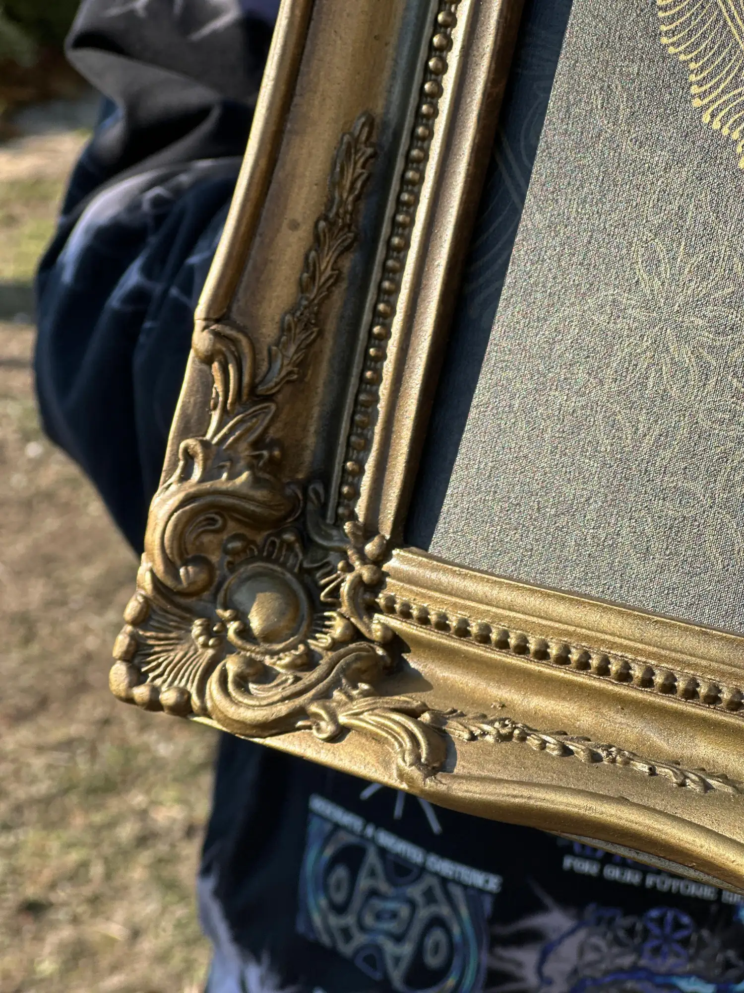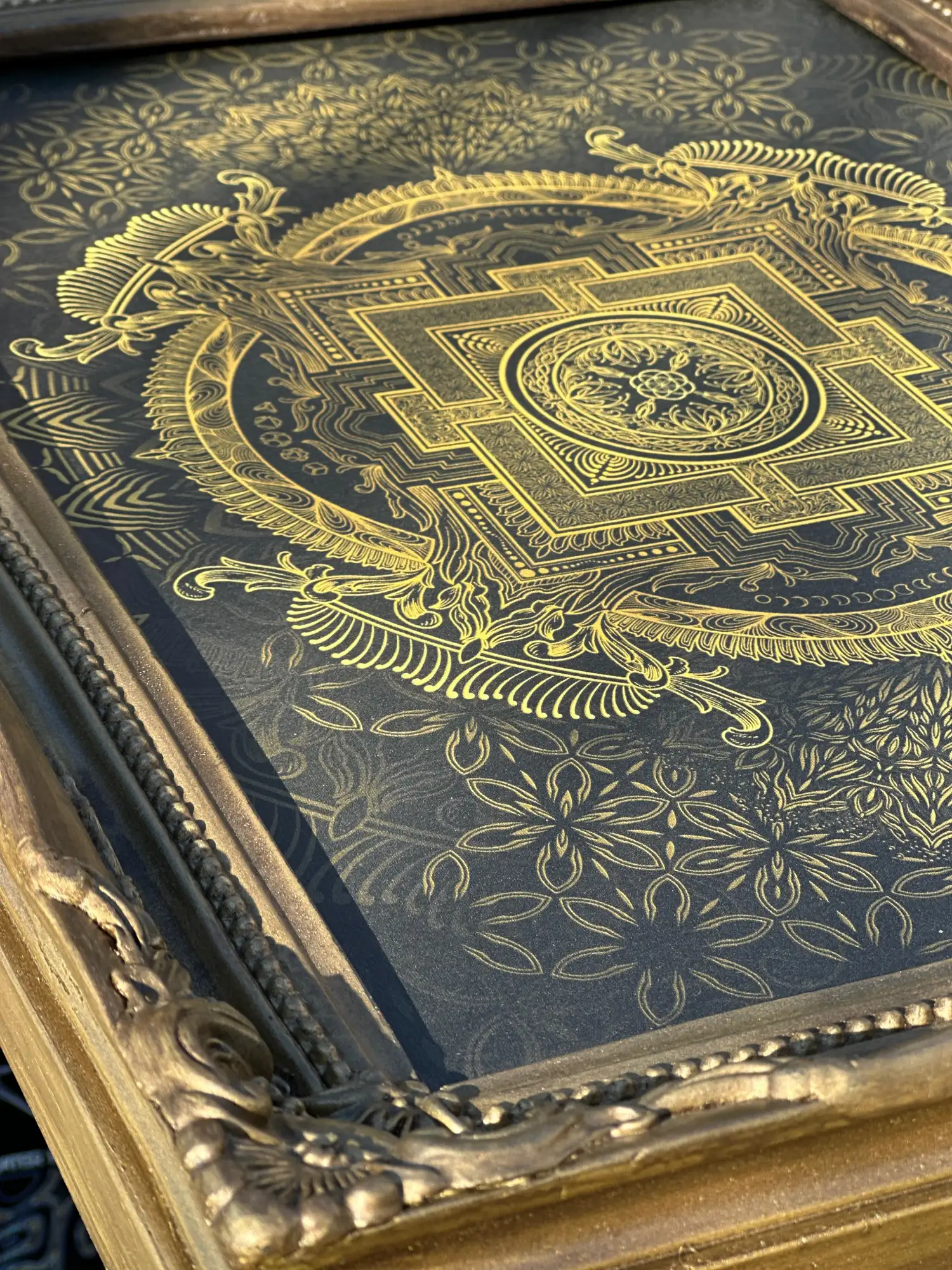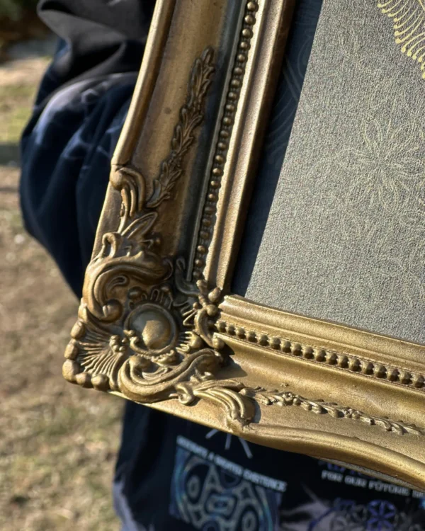 The piece is set in a hand-painted rococo resin frame, fully treated and finished by the artist. The gilded patina is crafted to resonate with the geometry itself, creating a unified object where artwork and frame belong to the same narrative.